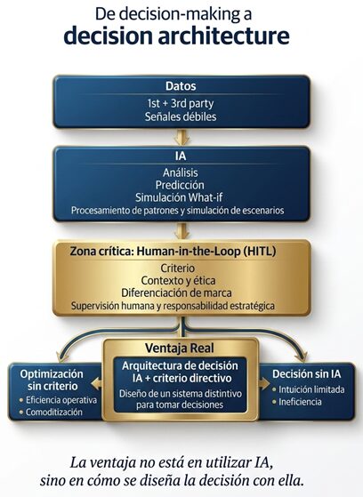 Estamos ante un cambio de paradigma: el paso del decision-making tradicional al diseño de la decision architecture. En este nuevo marco, el directivo de marketing deja de ser un intérprete de datos para convertirse en el arquitecto que define qué variables entran en el sistema y qué peso estratégico tienen (IBM, 2023). De esta manera, la IA no redefine la estrategia por lo que hace, sino por cómo obliga a rediseñar el sistema que decide.